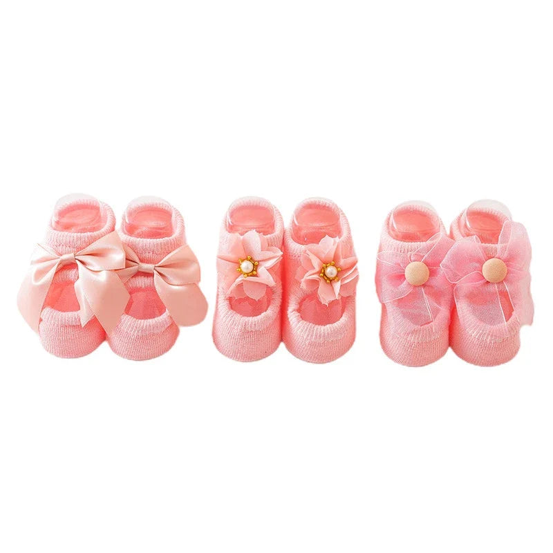 Dress your little one in elegance from head to toe with the TinyBloom Princess Socks — a charming 3-pair set designed for newborns and baby girls. Crafted from ultra-soft, breathable fabric, each pair features delicate lace bows, elegant chiffon flowers, and pearl embellishments that add a royal touch to any outfit. With a snug yet gentle fit and anti-slip soles, these socks are perfect for first steps, photo shoots, or simply lounging in style. Practical, adorable, and made with love — they’re a must-have in every baby girl's wardrobe.